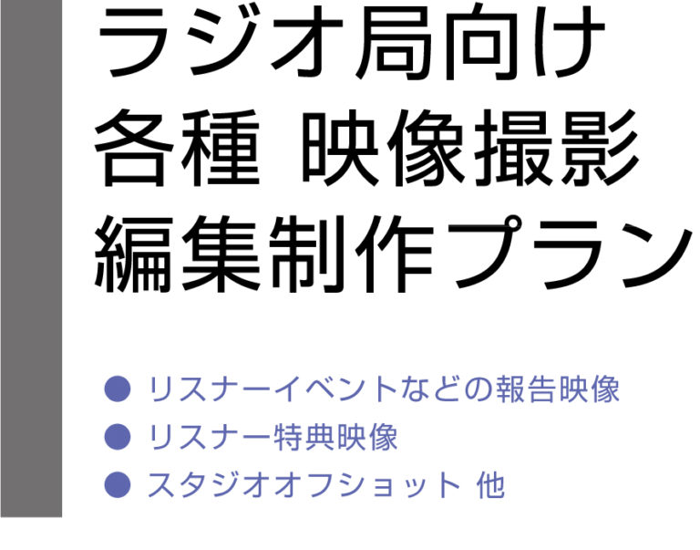 音声が主メディアであるラジオ局さま。しかし昨今の技術革新により、扱う媒体はかつてないほど多様化しています。とりわけ動画は、ラジオ局さまにとっても軽視できないほど重要なコンテンツになりつつあります。こうした動画の制作をお手伝いいたします。スタジオオフショット、リスナー特典映像、イベント実施記録などなど。さまざまな内容に柔軟にご対応可能。リーズナブルな価格設定も魅力です。ぜひご検討頂けますと幸いです。