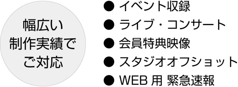 さまざまな内容に対応しています。台本が必要となる「制作もの」も大丈夫ですし、台本を用いない記録ベースのものもOK。特にスタジオオフショットなどは、台本なしで組むことも多いです。御社主導で制作をつかさどることもできますし、丸投げおまかせでの進行も可能です。
